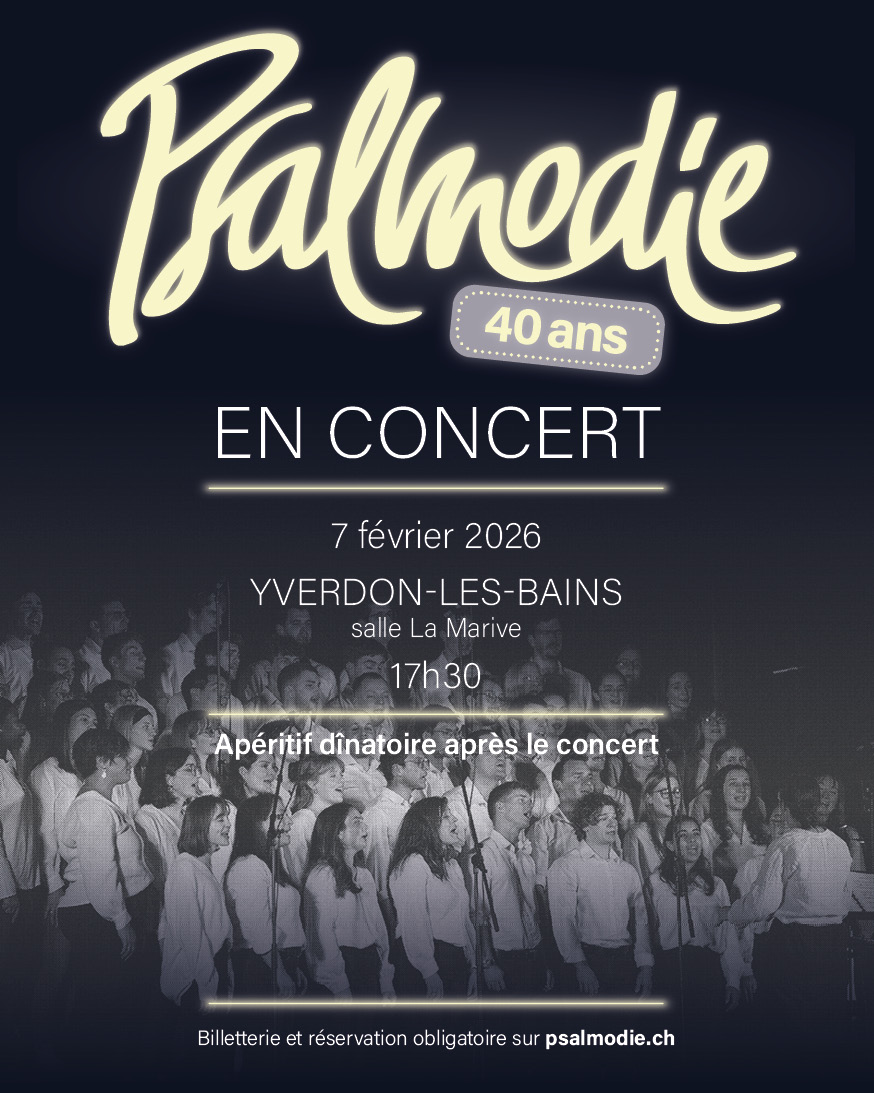 Psalmodie fêtera ses 40 ans lors d’un concert-événement le 7 février 2026 à17h30 à la Marive à Yverdon-les-Bains (Suisse).