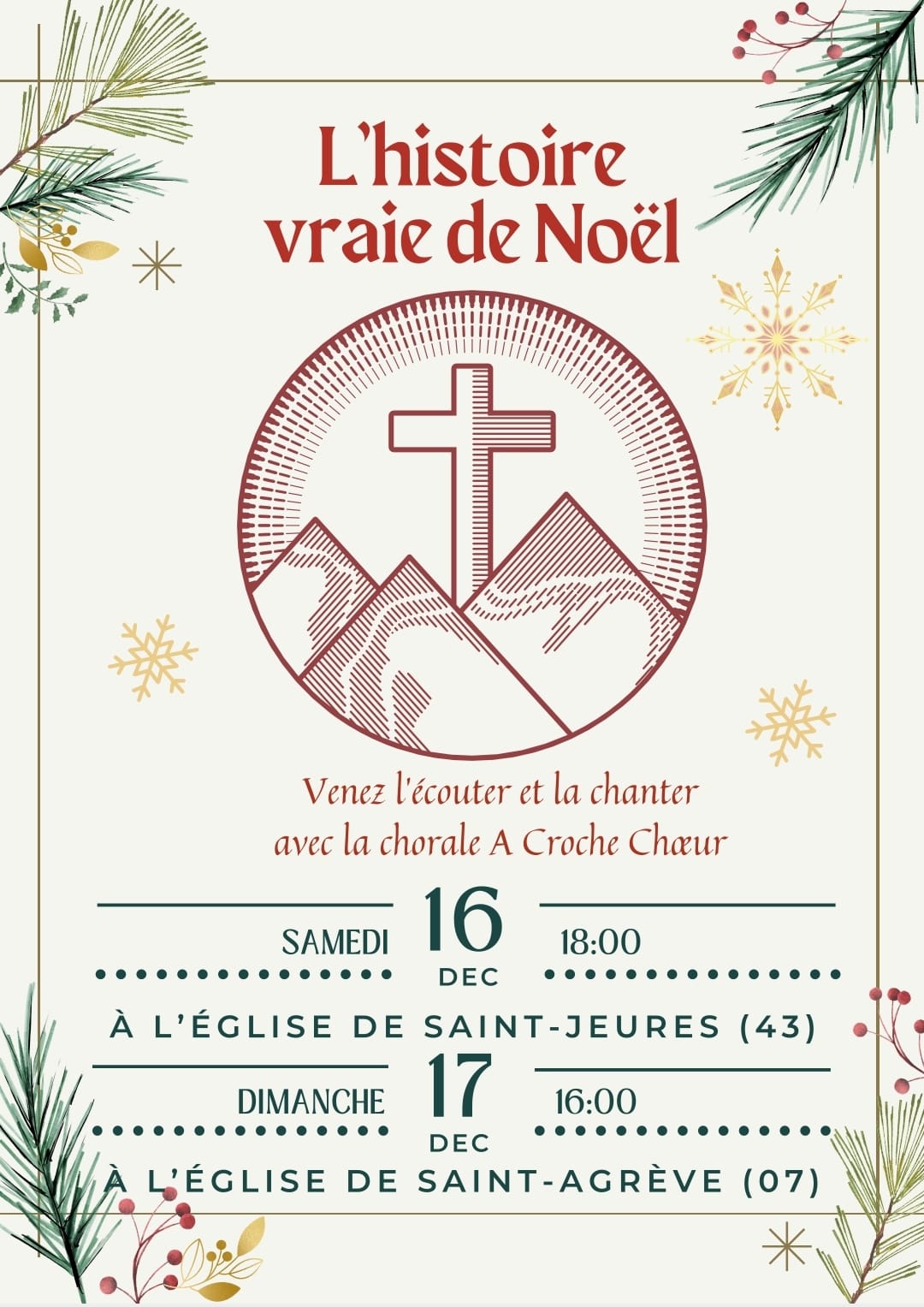 La chorale A Croche Chœur, créée en septembre 2018, rassemble maintenant une trentaine de choristes chrétiens, enfants, ados et adultes, de 10 à 80 ans, du plateau Ardèche/Haute-Loire, dans le but de chanter des chants et cantiques de différents pays, et chants de Noël à 4 voix. Par ces chants, la chorale espère vous apporter de la joie et de l’espérance.