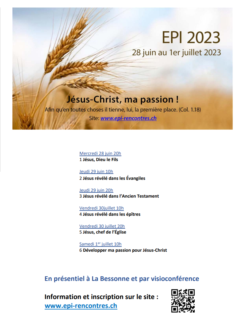 La rencontre autour de la Bible, EPI 2023 aura lieu du mercredi 28 juin (17h30) au samedi 1er juillet (14h), à La Bessonnaz en Suisse.