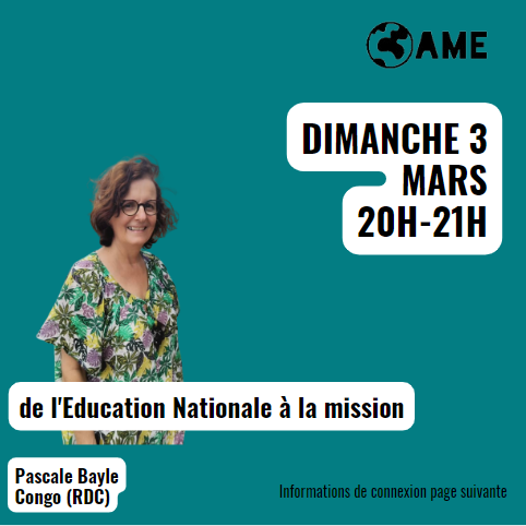 Pour nous sensibiliser et nous encourager au soutien à la mission, par le prière et le don, AME invite Pascale Bayle pour une webconférence. Celle-ci aura lieu le dimanche 3 mars prochain de 20h à 21h sur Zoom (modalités de connexion ci-dessous). Elle nous parlera de son service en RDC auprès des jeunes. Sa présentation sera suivie d’un temps de questions-réponses puis de prières. Nous vous remercions de bien vouloir diffuser ce message à votre église et à vos proches si ce n’est pas déjà fait par un autre membre. Vous trouverez ci-dessous les informations de connexion à la plateforme Zoom, accessible par Internet et par téléphone