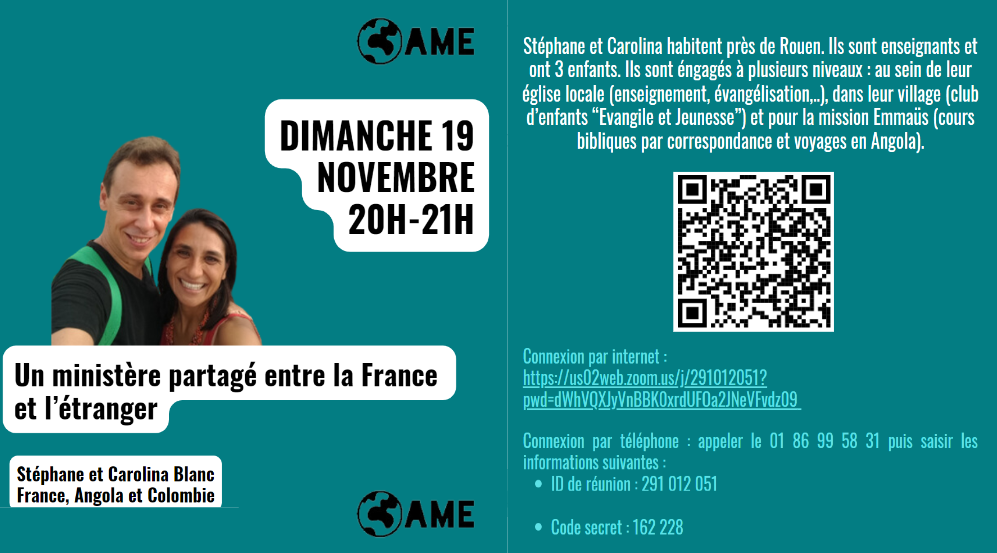 Pour sensibiliser et encourager à la mission, AME invite Stéphane et Carolina BLANC pour cette première conférence qui aura lieu le 19 novembre prochain de 20h à 21h sur Zoom (modalités de connexion ci-dessous).